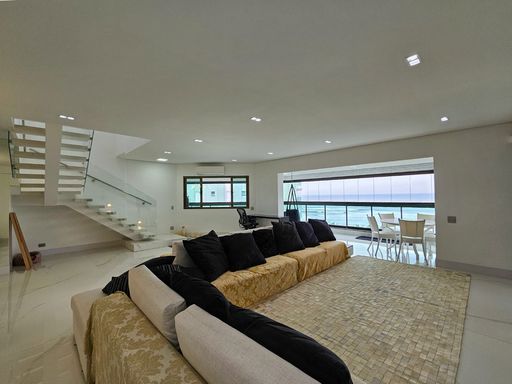 - 486,64m² de área útil - 05 suítes - Sala para 03 ambientes - Lavabo - 03 vagas de garagem - Varanda gourmet Pavimento térreo: - Sala de 03 ambientes integrados - Varanda integrada com bar - Lavabo - 04 suítes, sendo 01 suíte master com closet, todos os quartos com vista para o mar e sacadas privativas - Cozinha tradicional ampla - Suíte de serviço - Todos os ambientes finamente mobiliados e decorados, garantindo um ambiente sofisticado - Todos os ambientes climatizados, proporcionando conforto térmico Pavimento superior: - Área gourmet climatizada e equipada, com churrasqueira a gás, fritadeira, máquina de gelo, adega, cervejeira e uma boca de fogão - Espaço para rouparia de banho - 01 suíte mobiliada e decorada - Sistema de som embutido Área externa: - Área gourmet com TV, cervejeira, câmara fria e parrilha - Terraço solarium com vista espetacular - Piscina aquecida com bar molhado - Sauna seca - WC externo - Depósito Diferenciais: - Todos os ambientes climatizados - Automação completa com áudio e vídeo - Vista para o mar em 100% do imóvel - Finamente decorada - Acabamento de alto padrão - Sistema de ar condicionado embutido Esta cobertura oferece uma experiência residencial única, combinando luxo, conforto e tecnologia. Para obter mais informações ou agendar uma visita, entre em contato.