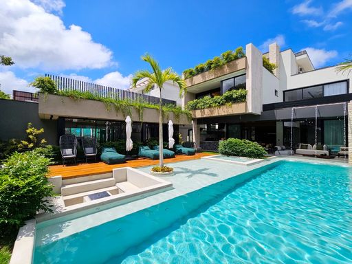 - 826,50m² área terreno - 667,47m² de área construída - 06 suítes - Suíte de serviço - 06 vagas de garagem Pavimento Térreo: - Hall com pé direito duplo - Sala 03 ambientes - Lavabo - 01 suíte - Cozinha americana integrada - Área gourmet integrada, cervejaria, máquina de gelo, churrasqueira a gás e carvão e chopeira - Área de serviço - Suíte de serviço Primeiro Pavimento: - 05 suítes, sendo 01 master com banheira - Copa auxiliar Área externa: - Piscina com prainha e cascata - Maquina de Pinball e mesa de sinuca - Hidro integrada com a piscina - Ducha fria - Sauna úmida - Praça do fogo - Telão de Led 175'' - WC externo - Depósito externo Diferenciais: - Ambientes climatizados - Nova nunca habitada - Sistema de áudio e vídeo completo - Mobiliada e decorada - Monitoramento - Piscina aquecida