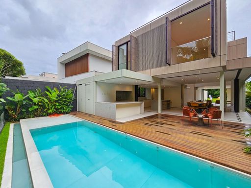 - Área construída 420,00m² - Área total 512,00m² - 02 pavimentos - 05 suítes, sendo 01 master com banheira - Suíte master no térreo - 04 vagas de garagem - Living para 02 ambientes - Cozinha americana integrada - Espaço gourmet Lazer - Piscina com hidromassagem - Sauna - Playground