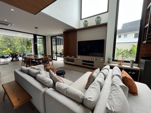 - 510m² de área total - 460m² de área construída - 02 suites no térreo - 03 suítes no pavimento superior, sendo 01 master com banheira - Lavabo - Living para 02 ambientes - Totalmente mobiliada e decorada - Todos móveis planejados SCA - Cozinha integrada com espaço gourmet - Churrasqueira com parrilheira - Todos ambientes climatizados com ar condicionado K7 - Automatização na casa inteira - Mesa de jantar para 08 pessoas - Fire place para 10 pessoas - Piscina aquecida com borda infinita - Entrada de serviço - Área de serviço - 05 vagas de garagem, sendo 01 coberta - Praça do fogo Experimente o máximo em conforto e luxo nesta residência exclusiva com 510m² de área total e 460m² de área construída. Este imóvel oferece dois andares de puro requinte: no térreo, duas suítes, e no pavimento superior, três suítes, incluindo uma master com banheira. O living para dois ambientes é totalmente mobiliado e decorado, com móveis planejados SCA. A cozinha integrada com espaço gourmet e churrasqueira com parrilheira torna qualquer refeição um evento especial. Todos os ambientes são climatizados com ar condicionado K7 e a casa inteira conta com sistema de automatização. A mesa de jantar acomoda oito pessoas, enquanto o fire place tem espaço para dez. Relaxe na piscina aquecida com borda infinita, com acesso fácil através da entrada de serviço e área de serviço. Com cinco vagas de garagem, sendo uma coberta, este imóvel oferece tudo que você precisa para uma vida confortável e sofisticada. Não perca a oportunidade de viver neste paraíso. Agende uma visita hoje mesmo e transforme seu sonho em realidade!