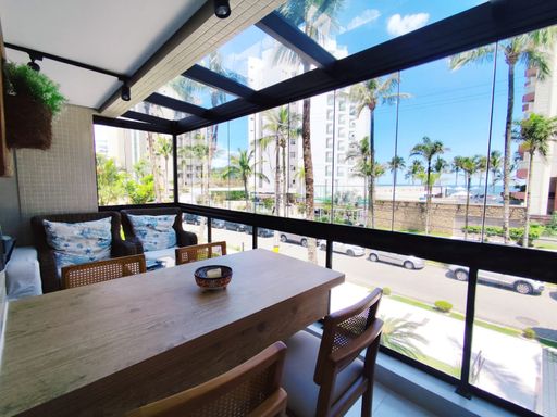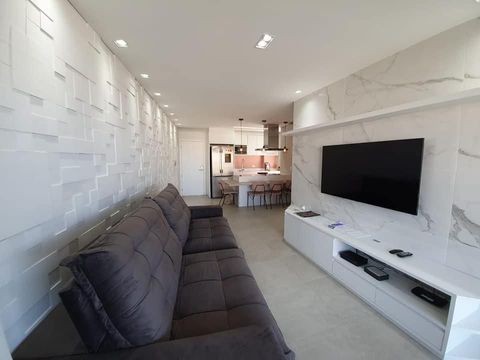 - 92,00m² de área útil - 03 dormitórios, sendo 01 suite - Sala para 02 ambientes - Cozinha americana completa e equipada com utensílios - WC social - Lavabo - Ambientes climatizados - 02 vagas de garagem - Vista mar