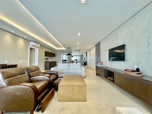- 220m² área útil - 04 suítes - Dormitório e banheiro de serviço - Mobiliado - Living para 03 ambientes - Sala integrada com varanda - Varanda gourmet com fechamento em vidro - Cozinha planejada - 03 vagas de garagem - Deposito individual Diferenciais: - Pé na areia e frontal ao mar - Iluminação moderna - Ar condicionado em todos os ambientes