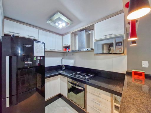 A cozinha americana, moderna e funcional, permite a interação com o living e a varanda, onde uma churrasqueira está à disposição para momentos de lazer e descontração.